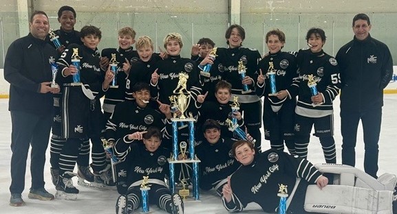 The 2011 New York City Hockey Club Bantams were crowned champions at the Columbus Day Shoot-Out in New Hampshire this past weekend. After falling short 3-2 to the 95 Giants in their first game, they rallied, winning the rest of their 5 games including a re-match with the 95 Giants in the semi-finals. They shut out Islanders Hockey Club 3-0 in the finals to clinch the trophy. Coaches Elvis Tominovic and Dan Levine were happy to see all players contributing to the wins. The boys really came together as a team this tournament with lots of hard work paying off on both offense and defense, with an impressive power play all weekend and backstopped by some outstanding goaltending.