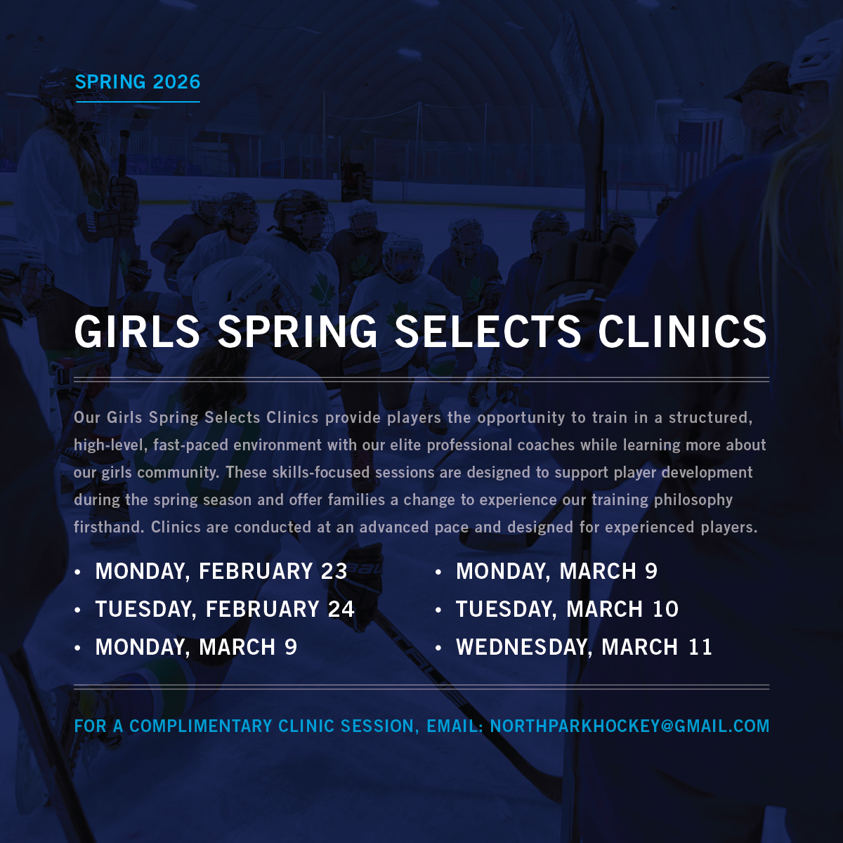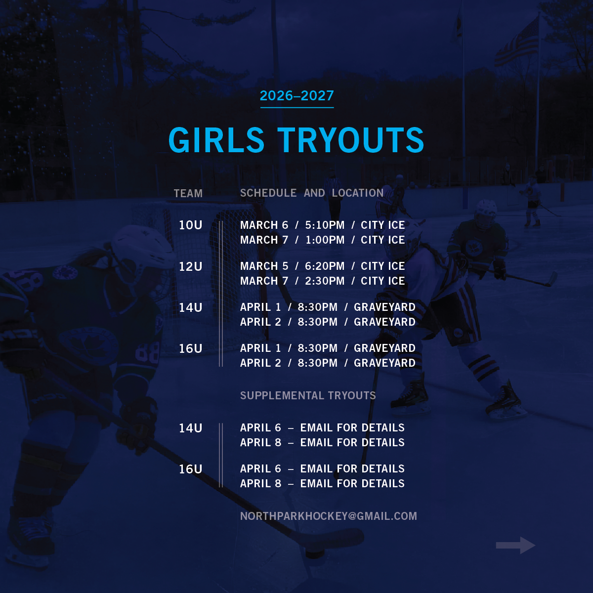 Following Girls Team Tryouts registration, players interested in Co-Ed Team Tryouts can email northparkhockey@gmail.com to register at an adjusted rate.